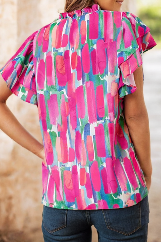 Abstract Brush Print Ruffled Sleeve Frill V Neck Blouse