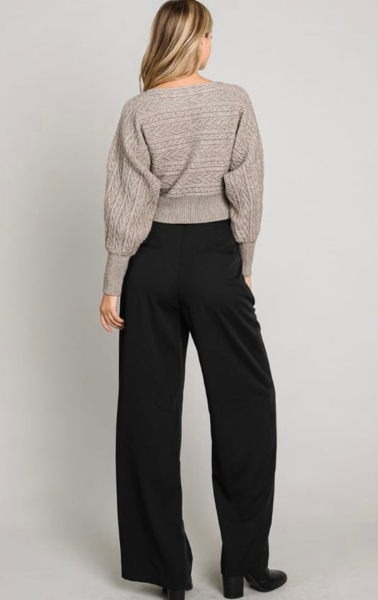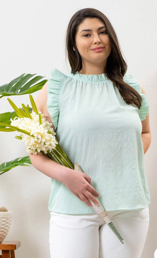 PLUS WOVEN WOOL RUFFLED SLEEVE HIGH-LOW TOP