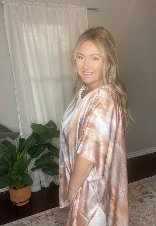 Beige Abstract Print Short Sleeve Open Front Kimono