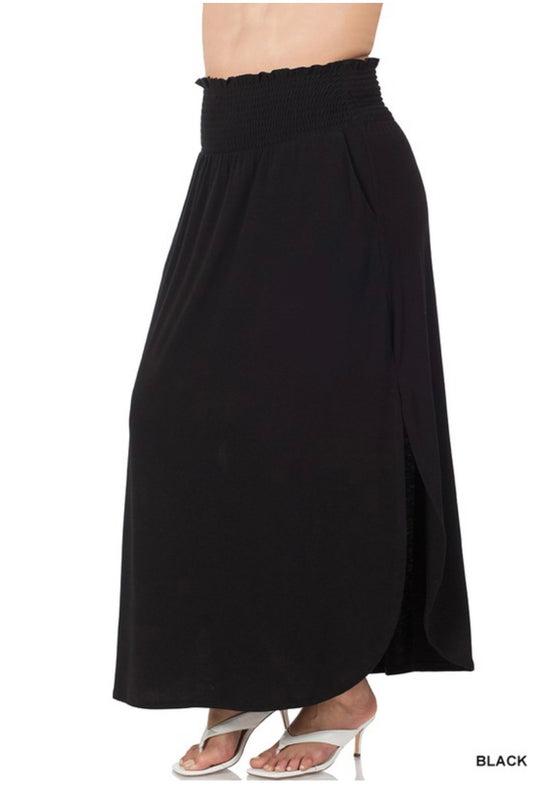 PLUS SMOCKED WAIST SIDE SLIT MAXI SKIRT WITH POCKETS