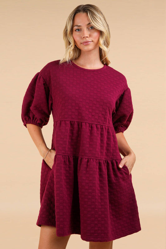 Quilted Knit A-Line Puff Sleeve Babydoll Mini Dress