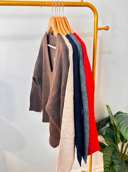 SOLID V NECK DROP SHOULDER KNIT SWEATER
