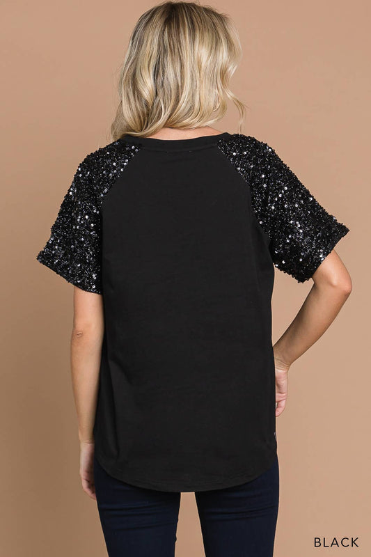 Washed Cotton Knit W/ Sequin Contrast Sleeve