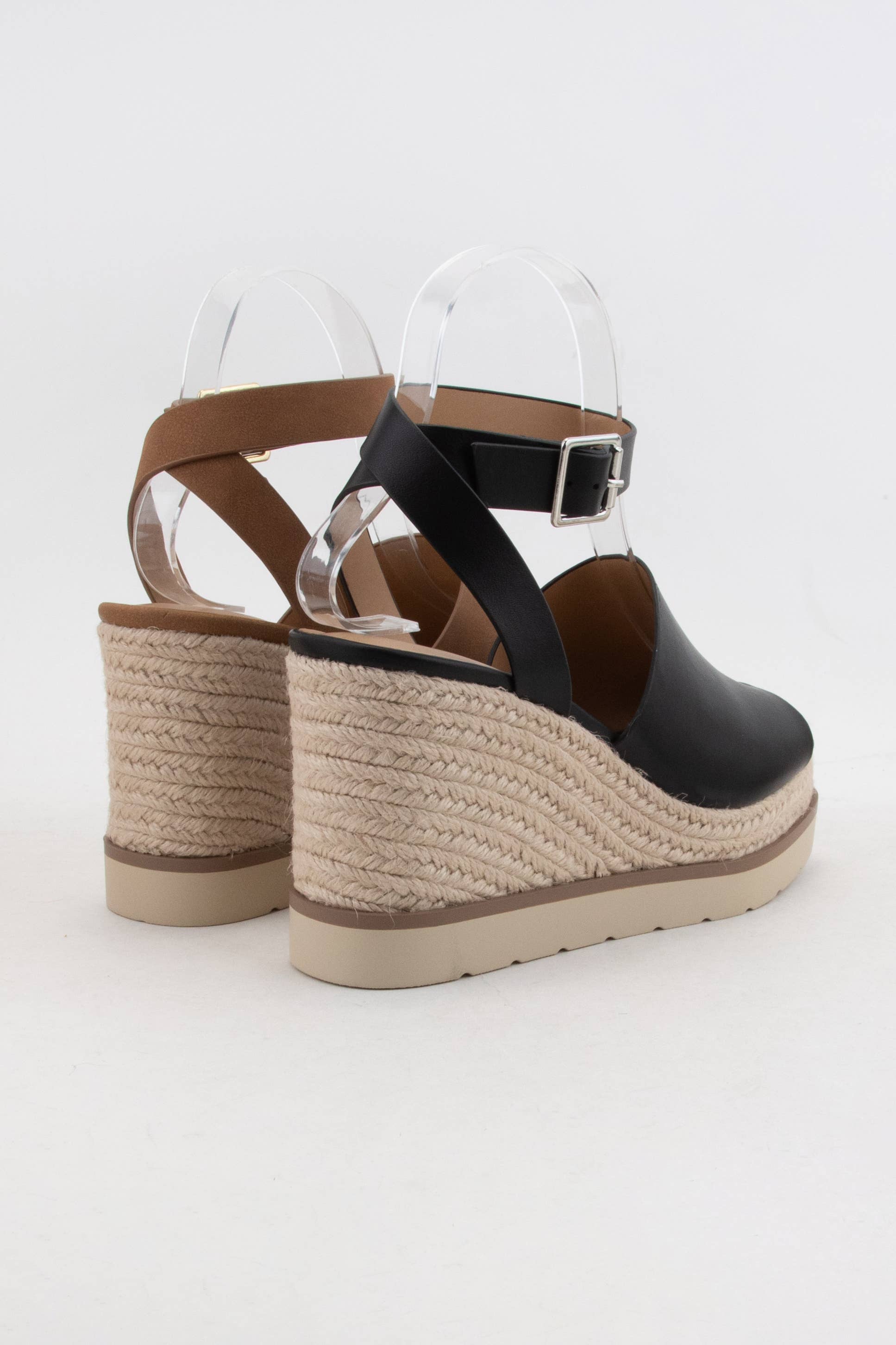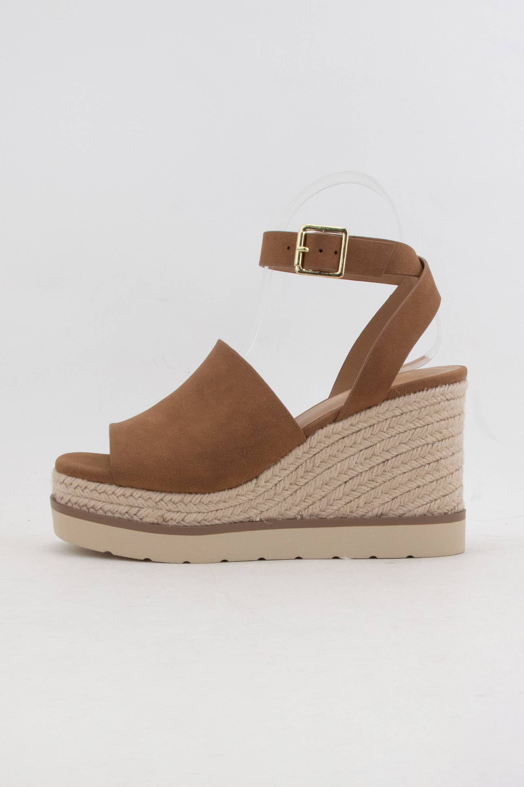 Designed with a peep-toe and adjustable ankle strap, a metallic buckle adds elegance to these sandals. The raffia-wrapped espadrille platform and faux leather material provide comfort, while the 4" heel and 2" platform elevate your look.